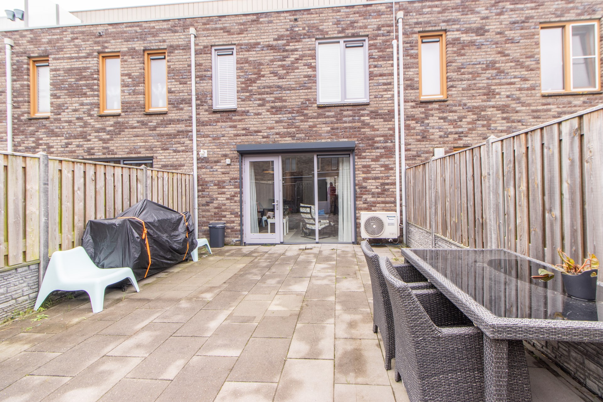 De ruime achtertuin biedt privacy en comfort, beschikt over: