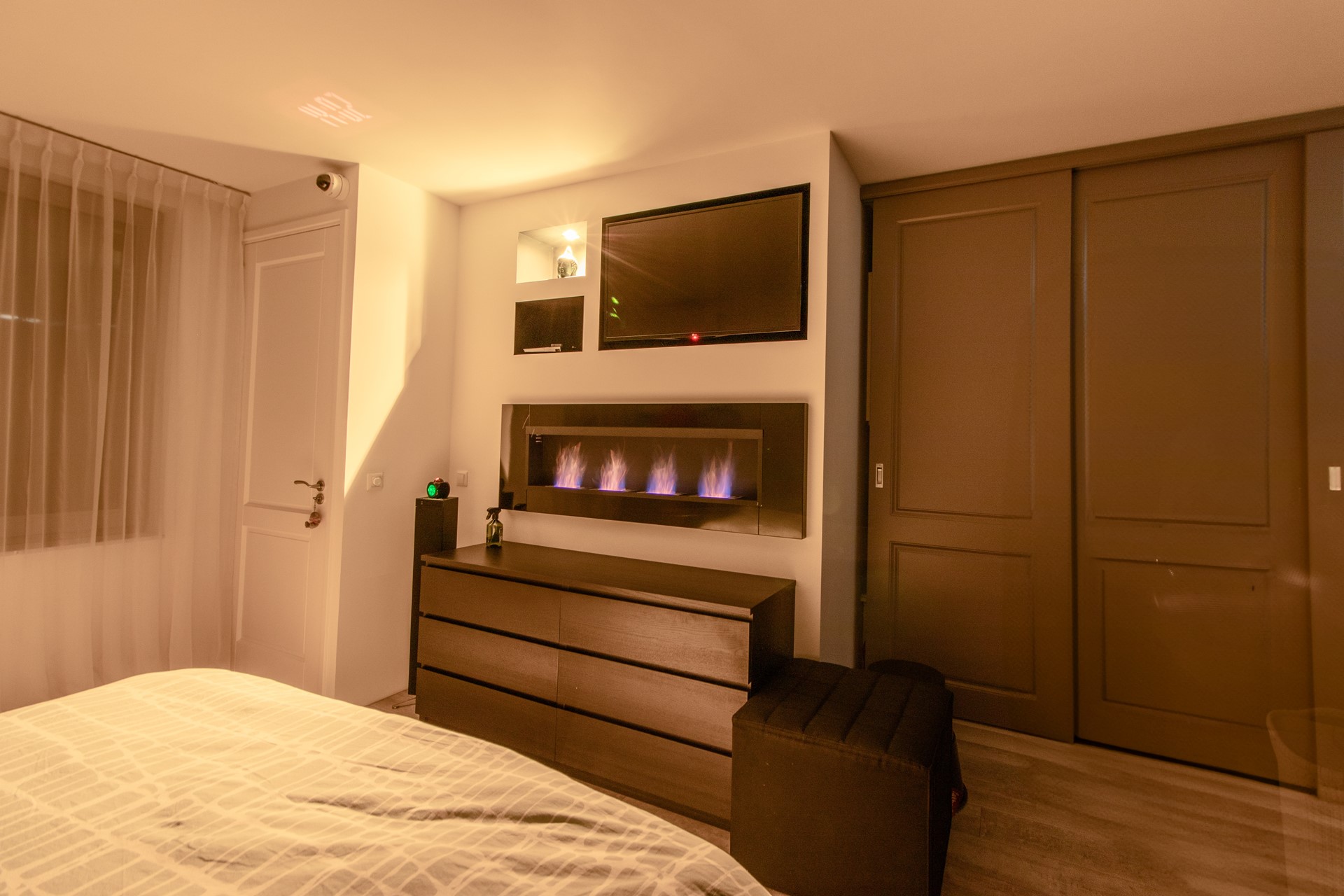 Perfect voor rustige avonden, quality time of een film kijken vanuit bed met de haard aan. Een privéplek die aanvoelt als een luxe hotelsuite.