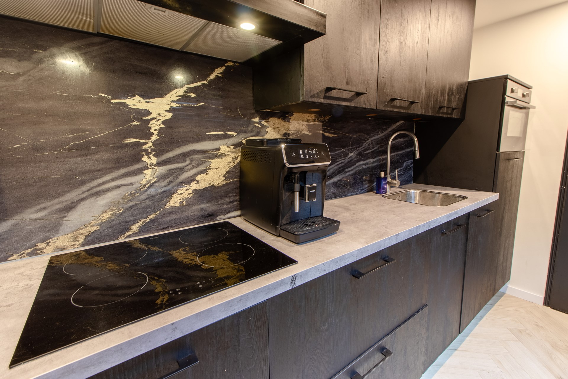 Modern black kitchen with a rustic touch, induction hob, and oven