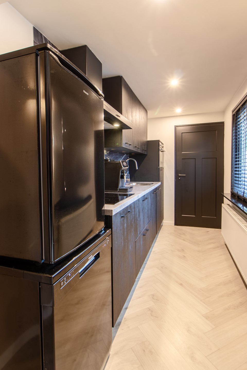Moderne zwarte keuken met landelijke touch, inductiekookplaat en oven