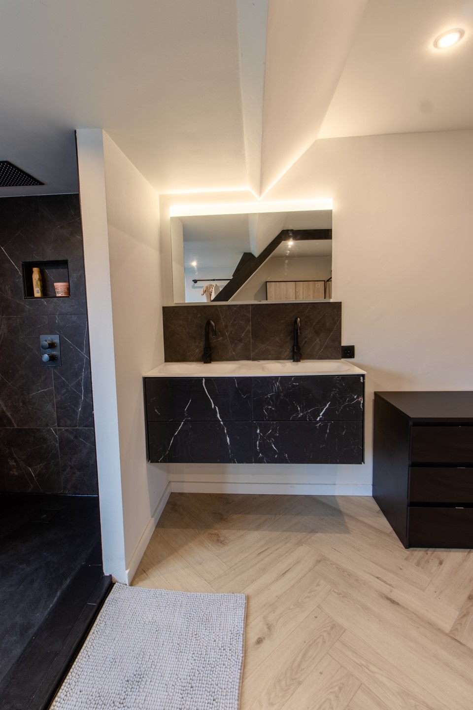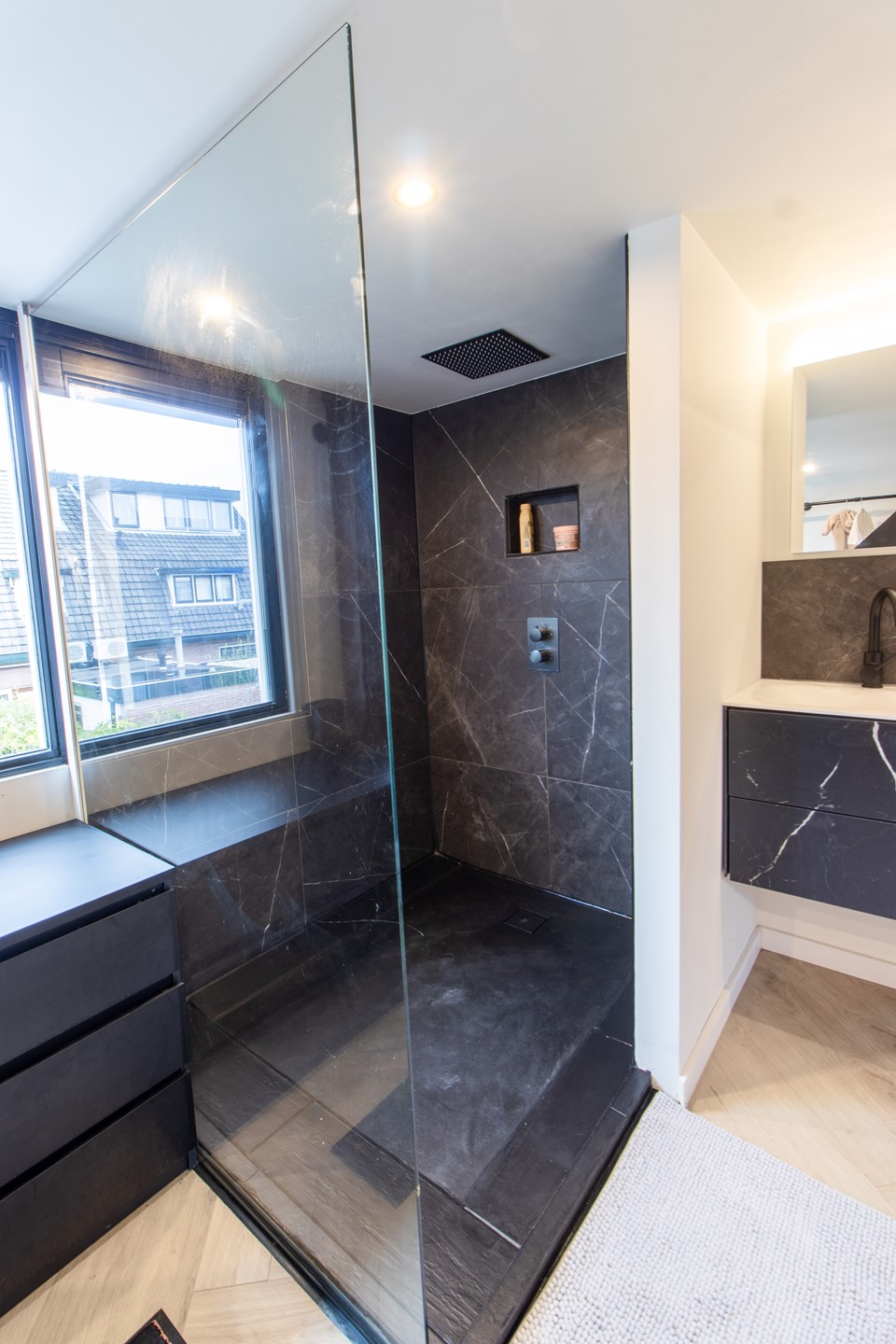Ruime badkamer met inloopdouche en luxe stortdouche, weggewerkt in het plafond