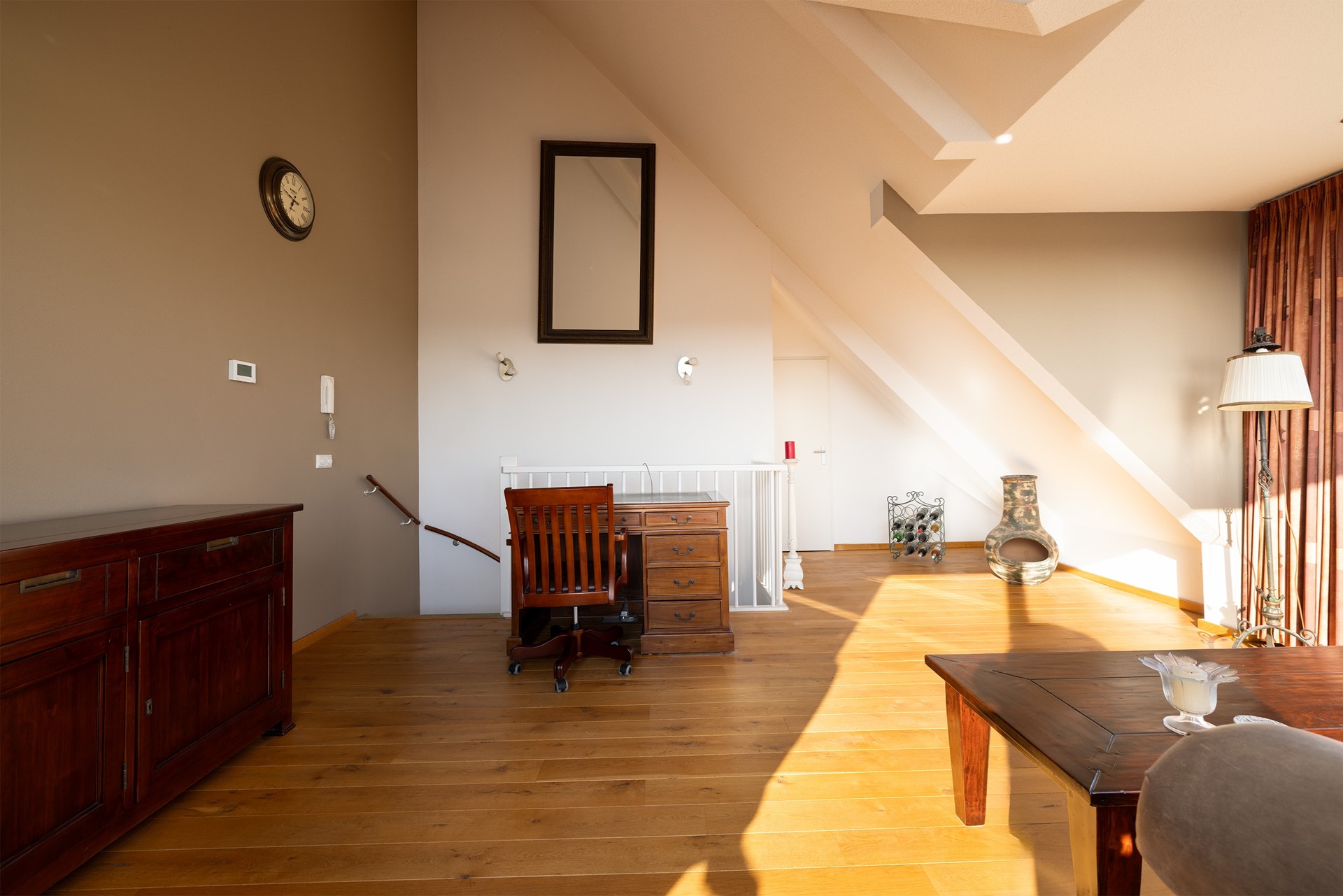 De royale woonkamer is een echte blikvanger dankzij het hoge plafond tot maar liefst 4 meter in de nok en het weidse uitzicht over de weilanden. De eikenhouten vloer en strak afgewerkte Spachtelputz-wanden geven de ruimte een warme en moderne uitstraling. Daarnaast is er een berging met cv-ketel en meterkast.